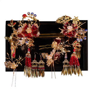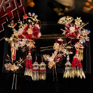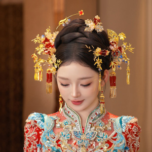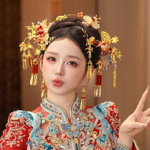 新娘秀禾头饰红色新款高级复古红金色水晶发簪中式汉服龙凤褂发饰