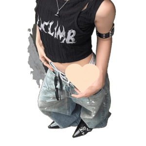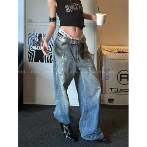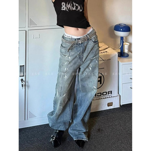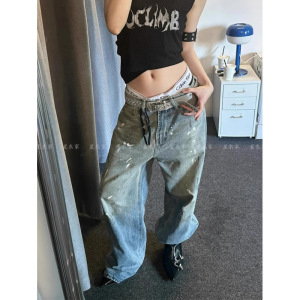 设计感泼漆涂鸦牛仔裤子女慵懒风夏季街头阔腿拖地裤