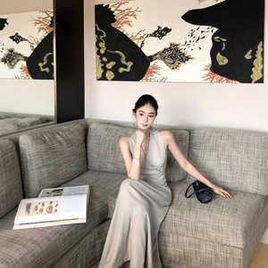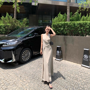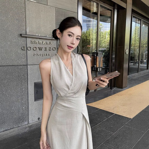 实拍现货2025春夏季新款高品质优雅一片式收腰连衣裙气质V领长裙