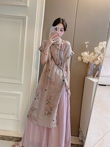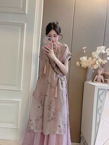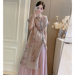 中国風の夏の茶服スリットバックルレディースミドル丈ドレス斜め前立てサイドクリアスーツ文学冷風ローブ