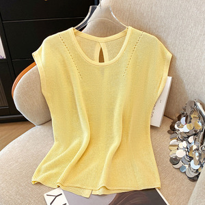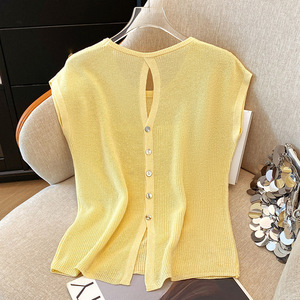 ネットワーク全体で人気のフレンチスタイル中空バックシングルブレストスリットセーター女性用2025夏の新しいファッションスリムで薄い