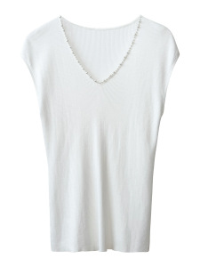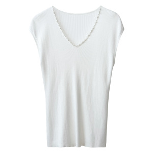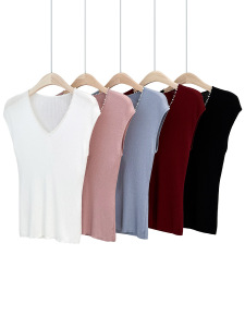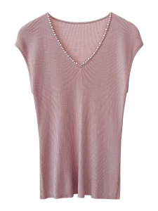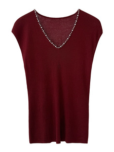 天丝桑蚕丝钉珠V领无袖针织衫女短袖t恤套头羊毛针织上衣通勤风