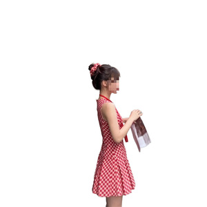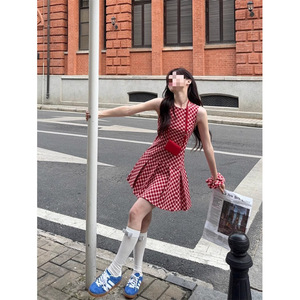 i甜辣妹风格纹无袖背心连衣裙女夏季新款法式复古百褶A字裙短裙子