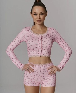 跨境电商花卉印花套装圆领紧身长袖上衣短裤欧美家居服
