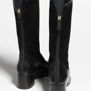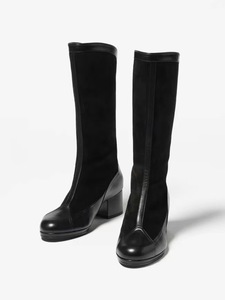 2025秋冬新款法式小香风拼接撞色圆头粗跟后拉链百搭中筒靴女
