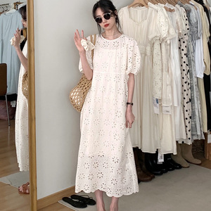 韩版镂空刺绣花朵泡泡袖连衣裙夏季新款温柔风气质长裙休闲A字裙