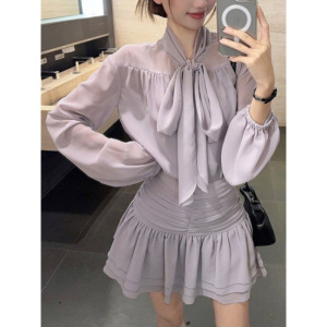法式套装chic名媛淑女风气质蝴蝶结长袖衬衫高腰显瘦半身长裙女