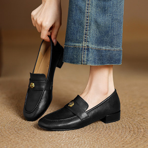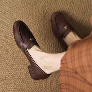 英国風椿スモールレザーシューズレディースフラットヒールシューズ春秋新作レトロ本革ラウンドトゥスリッポンローファー