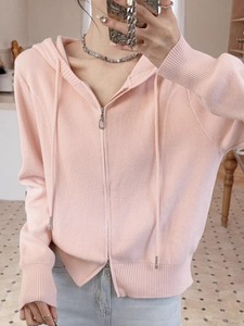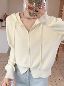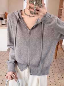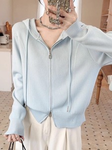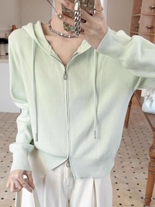 连帽双拉链软糯长袖针织开衫毛衣外套女春季时尚气质帽衫休闲上衣