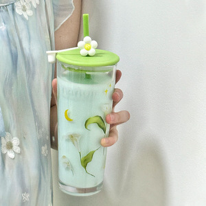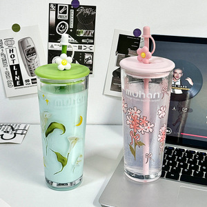 女の子向けの見栄えの良いオフィスフラワーコーヒーカップ、大容量のティーカップ、高級ガラスカップ、家庭用ストローカップ