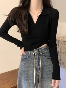睛雅服饰灰色POLO领针织打底衫女夏季2025年新款纯欲修身短款上衣