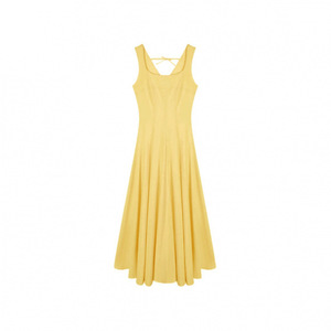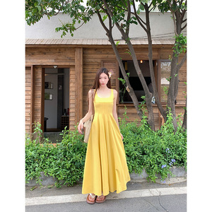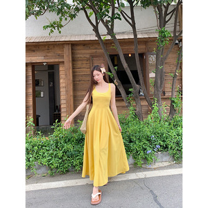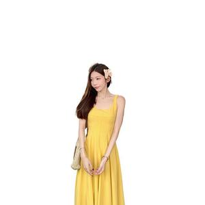法式气质U领黄色吊带连衣裙女夏季裙子收腰显瘦大摆裙度假风长裙