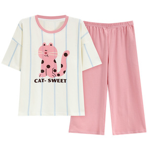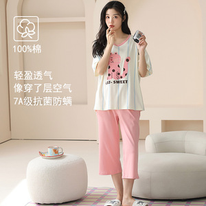 クラス A 抗菌綿パジャマ女性の夏の半袖クロップドパンツ女子学生漫画大きいサイズ綿ホーム服