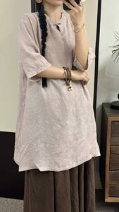 2025 夏文学レトロスタイルジャカードリネンスタンドカラーボタン両サイドスリット中国プルオーバーシャツトップ女性のための
