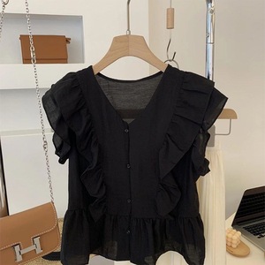 フレンチフリルVネックショートシフォンシャツ女性用2025夏新スタイルシックな年齢軽減痩身ベビードールシャツトップ