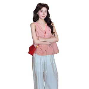 2025 新しい夏スタイルのラミー刺繍美しい静かな不規則なラブピンクトップと女性のための 9 点パンツスーツ
