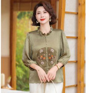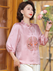 中老年妈妈洋气小衫春季国风上衣中年人女春夏装套装阔太太雪纺衫