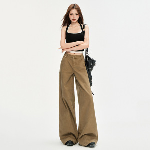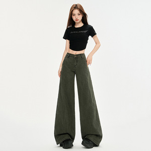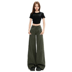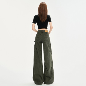 秋の女性向けハイストリートブーツカットジーンズ、アメリカンデザインのミリタリーグリーンワークウェア、フロアレングスのゆったりとしたワイドレッグパンツ