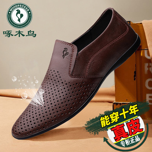 啄木鸟正品皮鞋男真皮软底软面镂空洞洞鞋休闲一脚蹬中年工作鞋男