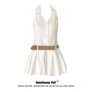 温柔风v领挂脖露背连衣裙女夏季收腰显瘦翻领百褶a字短裙
