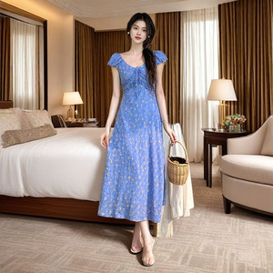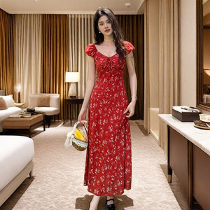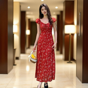 法式泡泡袖V领碎花连衣裙女夏季收腰显瘦高级感度假风气质长裙