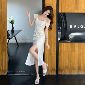 实拍现货设计感斜肩立体花朵吊带显瘦开叉收腰斜裁气质缎面连衣裙