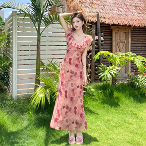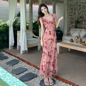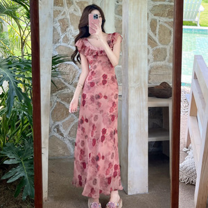 实拍现货2025夏季新款法式复古玫瑰印花荷叶边长款收腰显瘦连衣裙