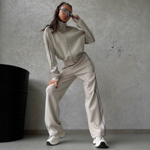 2025新款跨境欧美亚马逊休闲套装长袖半高领开衫卫衣系带条纹长裤