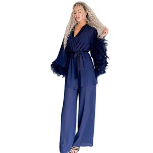 欧美跨境上衣吊带长裤绑带开衫毛毛袖睡衣女家居服三件套一件代发