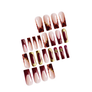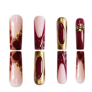 国境を越えた売れ筋ヒョウ柄ゴールドエッジウェアラブルネイルワインレッドスクエアマニキュアパッチメーカー完成品卸売