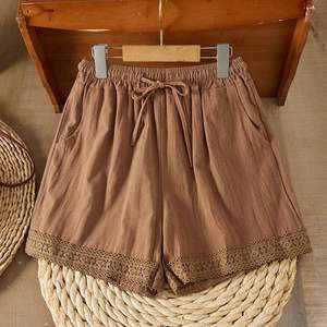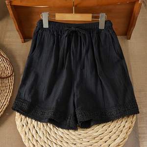 2025 夏新レトロ中空かぎ針編み綿とリネンのパンツ女性の文学レースショーツカジュアルパンツスリムストレートパンツ夏