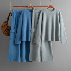 クロスボーダーファッションラウンドネックルーズニットスーツ女性のための 2025 秋と冬のカジュアルスタイルワイドレッグパンツ 2 点セット