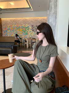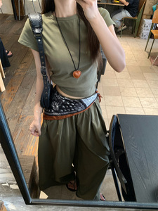 2025年夏の新作、スカーフ付きTシャツ、オーバーオールスーツ、レディーストップス、ワイドパンツ、レイジースタイルツーピースセットの実物写真