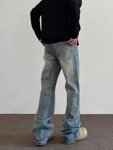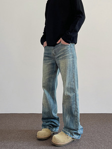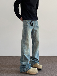 水洗做旧竹节纹牛仔裤男潮牌新款美式宽松复古微喇休闲长裤子男装