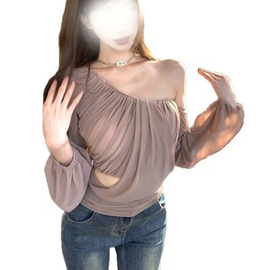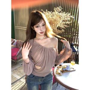 不规则纯欲斜肩长袖T恤女装夏季网纱拼接褶皱修身设计感辣妹上衣