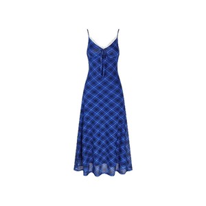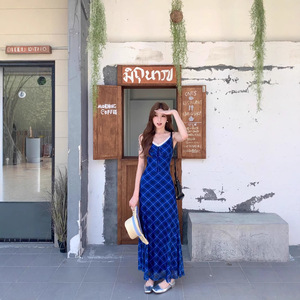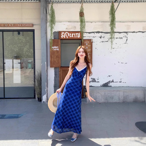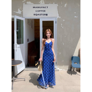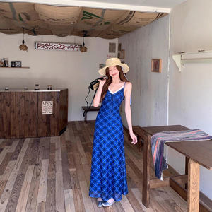 法式复古蓝色格子吊带连衣裙夏季蕾丝花边裙子网纱气质包臀长裙