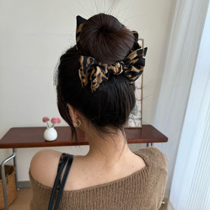 秋の定番ヒョウ柄リボンヘアピン、女性用高級後頭部ヘッドギア、気質ハーフタイヘアスプリングトップクリップ