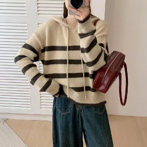 韓国スタイルのフード付きストライププルオーバーセーター女性のための秋と冬の新しい小さなニットセーターカジュアル西洋スタイルの女性のためのコントラストカラートップ