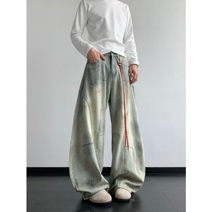 アメリカンレトロハイウエストシミタージーンズメンズ春秋ハイストリートデザインストレートレッグルーズスリムワイドレッグパンツ
