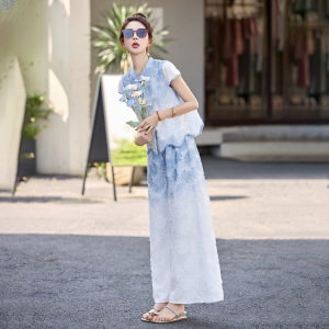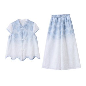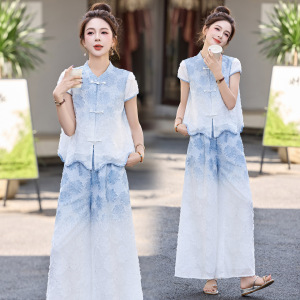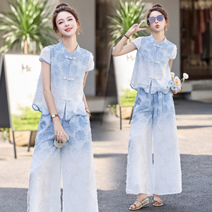 新しい中国風の女性用スーツ、夏のファッション、レトロなボタン、グラデーションカラーのワイドレッグパンツ、ファッショナブルでスタイリッシュな2点セット