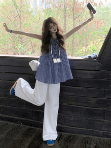 韓国のレトロな青と白のチェック柄ベストノースリーブトップ女性のためのルーズでスリムなレースアップベビードールシャツ夏
