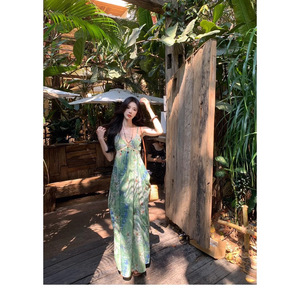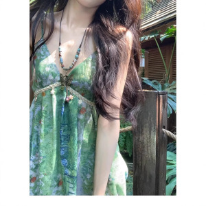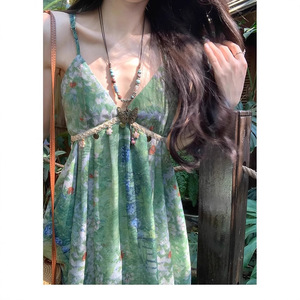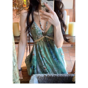 夏季度假风绿野仙踪吊带v领(胸口小低连衣裙显白显瘦气质露背裙