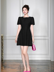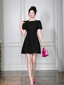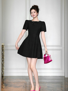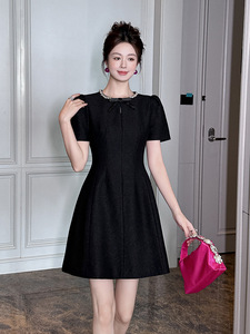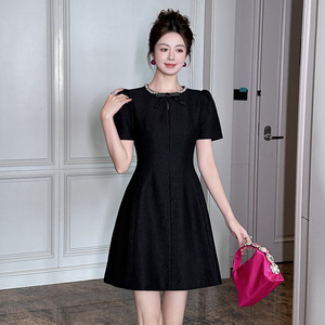 フレンチヘップバーンスタイルブラックリボンドレスレディース2025年夏ピンチウエスト美しいAラインショートスカート9008