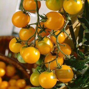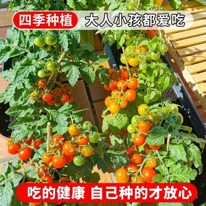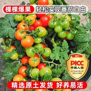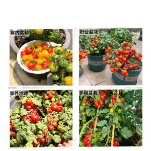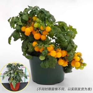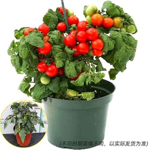 花と果実が咲く低生トマト苗鉢植え、四季咲きミニトマト苗、バルコニーで果実が破裂