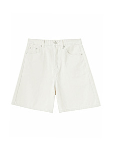 オフホワイトデニムショートパンツレディース夏薄手大きいサイズファットMMハイウエストゆったりスリムストレートワイドレッグ5点パンツ