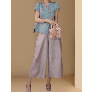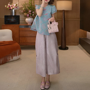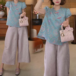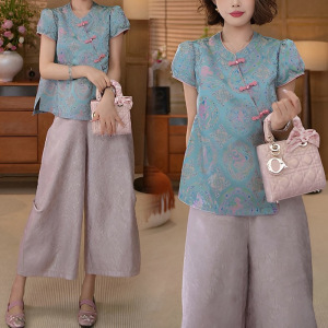 ジャカード 2025 夏新中国風スーツ女性のハイエンドジャカードボタン半袖トップワイドレッグパンツツーピーストレンディセット