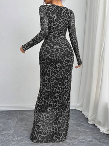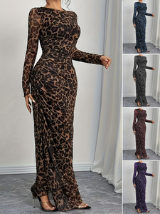 2025年欧米風エレガントなヒョウ柄スリムフィットシースルー長袖ワンピース、女性らしいウエストシェイプタイトメッシュロングドレス