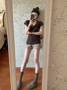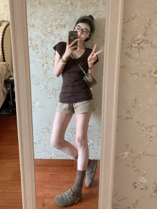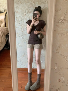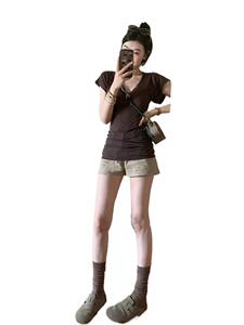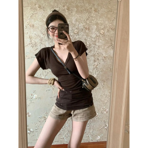 レトロブラウン V ネック半袖 T シャツレディース夏 2025 新しいスリムフィットベーシックホットガール多用途トップ