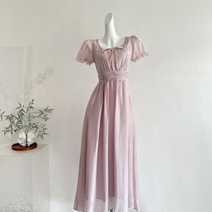ツートンカラーのレーススクエアネックパフスリーブウエストニッチドレスロングスカート