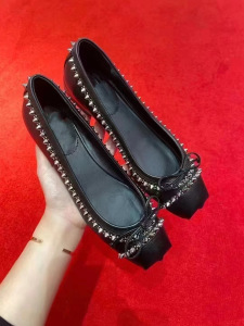 CL同款蝴蝶结夹皱猪鼻子红底鞋2025年春秋新款铆钉方头单鞋女平底